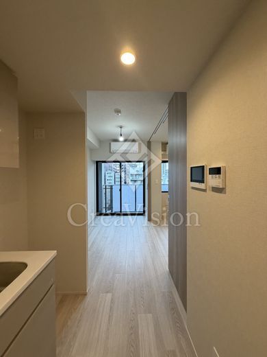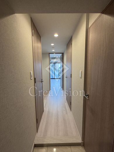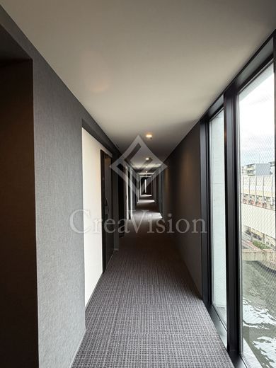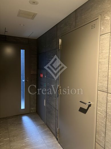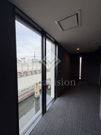建物に入ってまず好印象だったのが共用部です。内廊下は暗いイメージを持たれがちですが、本物件は等間隔に大きな窓が設けられており、自然光がしっかり差し込む明るい空間となっていました。場所によっては隅田川や東京スカイツリーを望むことができ、開放感も感じられます。