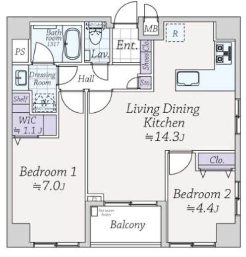 | 間取り | 2LDK+WIC | 面積 | 57.68m2 |