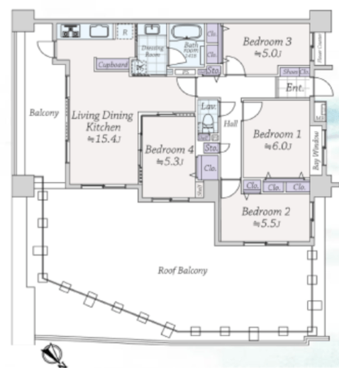 | 方角 | 南東 | バルコニー面積 | 63.7m2 |